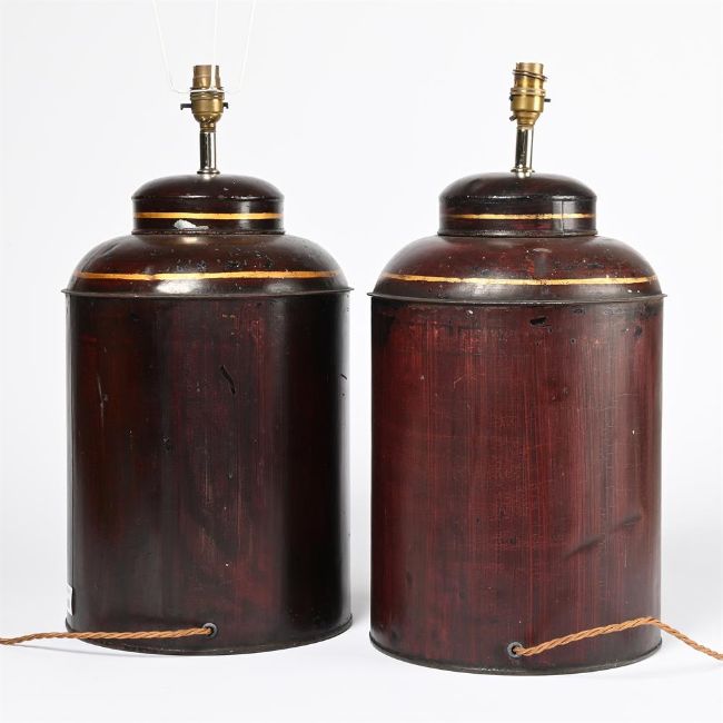 A PAIR OF TOLEWARE TEA CANISTER TABLE LAMPS