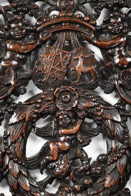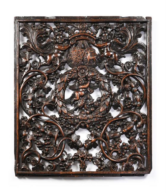 With ornately scrolling vine leaf and grapes around central crown with putti supporters with two armorial shields below, the arms of German or Austrian origin