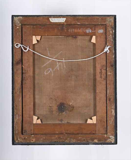 Surface dirt and scattered stains. Craquelure throughout with associated flecks of paint loss. Inspection under UV reveals an unevenly applied green varnish and numerous retouchings, most notably to the sitter's eyes and visage, ruff, and scattered across the background. A restoration, probably of an old tear, is present to the lower centre beneath the ruff. This is also reflected in a patch of sealant to the reverse.