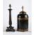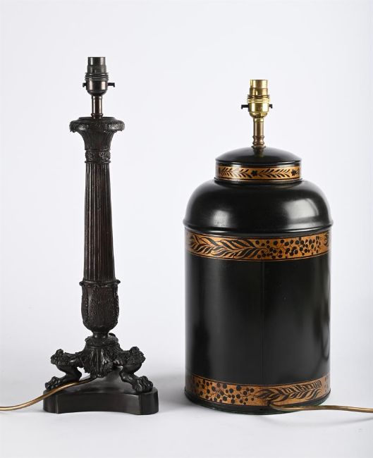 TOGETHER WITH a painted tole 'tea cannister' table lamp diameter 44cm high, 20cm diameter and another cast metal table lamp in louis phillipe style 49cm high 15cm