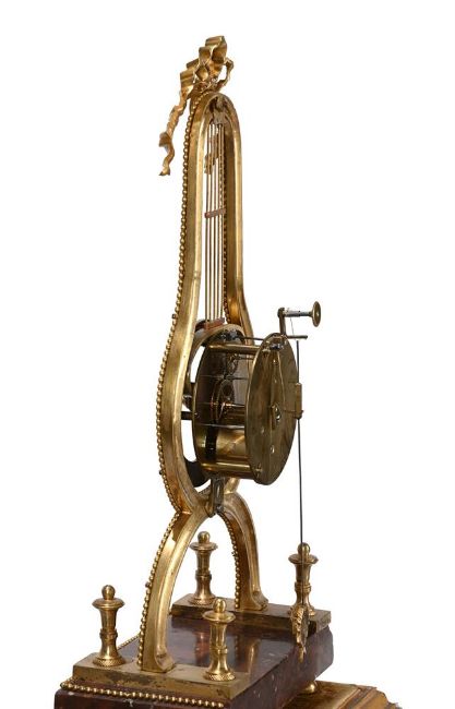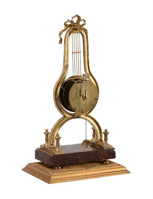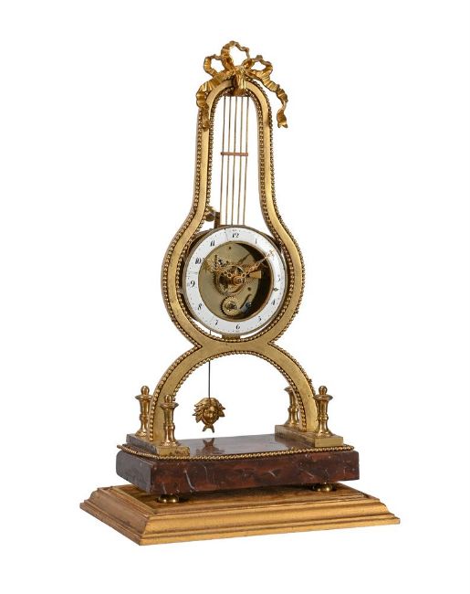 A FRENCH DIRECTOIRE PERIOD ORMOLU AND ROSSO FRANCIA MARBLE LYRE-SHAPED SKELETON TIMEPIECE