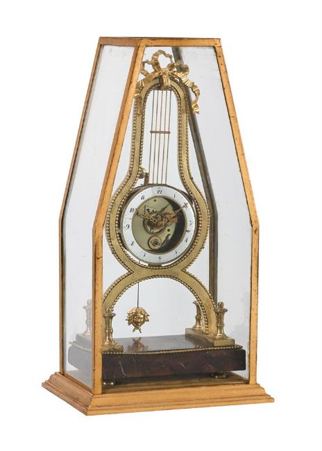 The circular eight-day single train movement with anchor escapement regulated by gilt female mask bob pendulum incorporating silk suspension, the dial with open centre within narrow enamel chapter ring with vertically aligned Arabic hour numerals and red Arabic five minutes to outer track, with fine scroll pierced gilt brass hands, the case formed as a pear-shaped lyre with ribbon cast bow crest and bead moulded edge to the frame, on integral arched support terminating with transverse stretcher plates applied with engine-milled waisted finials, set on a marble plinth with gilt bead moulded edge and brass bun feet; under a later gilt metal framed five glass cover with canted side panels and ogee moulded platform base.