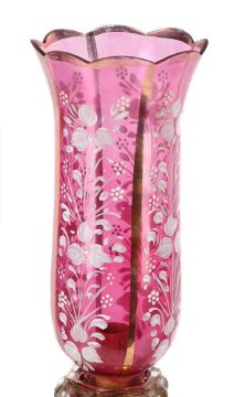 A PAIR OF NEAR EASTERN RUBY-FLASHED GLASS TABLE LAMPS WITH STORM SHADES