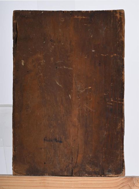The picture surface has dirt and discolouration throughout. To the edges, the surface has patches where the layer of paint was lost and the panel is visible. There is a whole to the extreme upper centre, possibly where a nail was placed for hanging. There is a surface scratch is running vertically from the top to the bottom. UV inspection reveals a scattered area of retouching to the seater's face.
