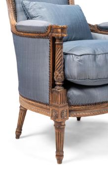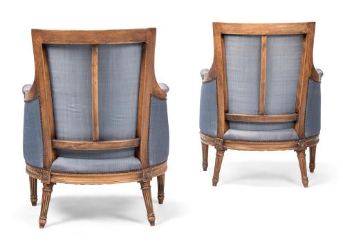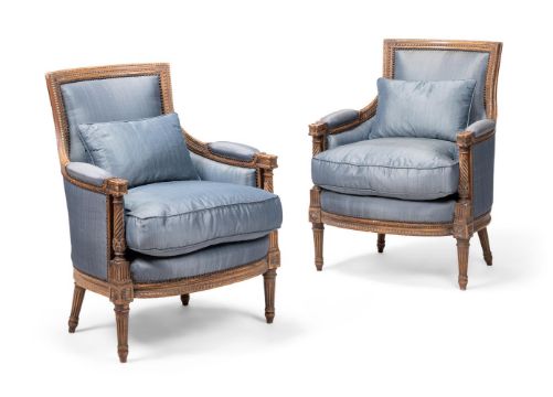 A PAIR OF CARVED BEECH AND SILK UPHOLSTERED FAUTEUIL