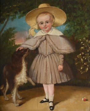 PORTRAIT OF A CHILD WEARING A STRAW HAT, WITH A DOG IN A LANDSCAPE