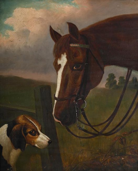 PORTRAIT OF A CHESTNUT HORSE WITH HOUND