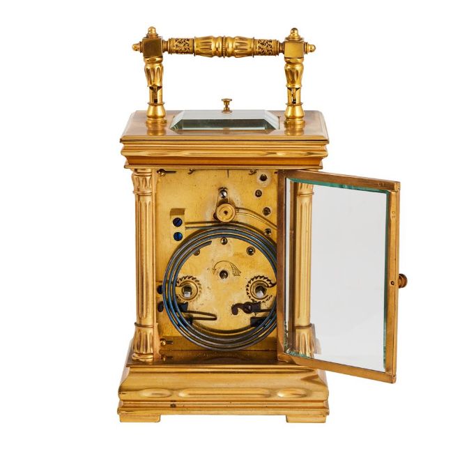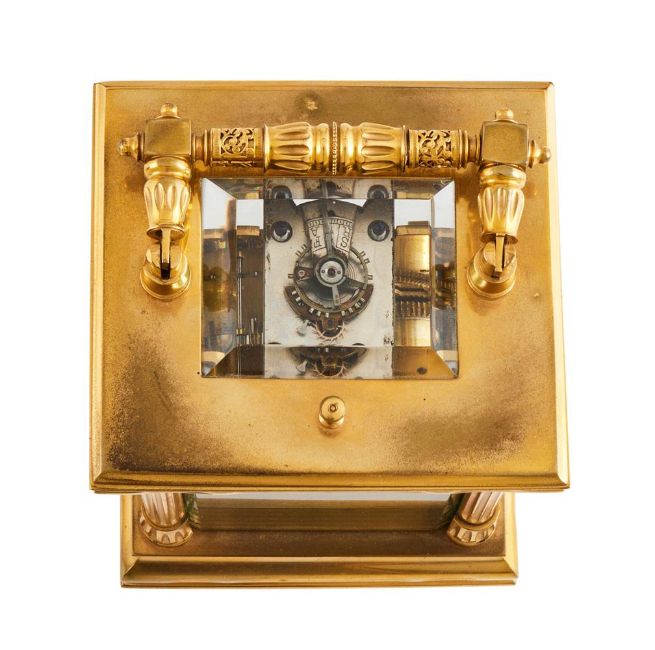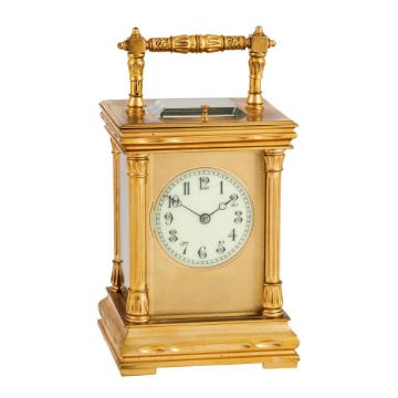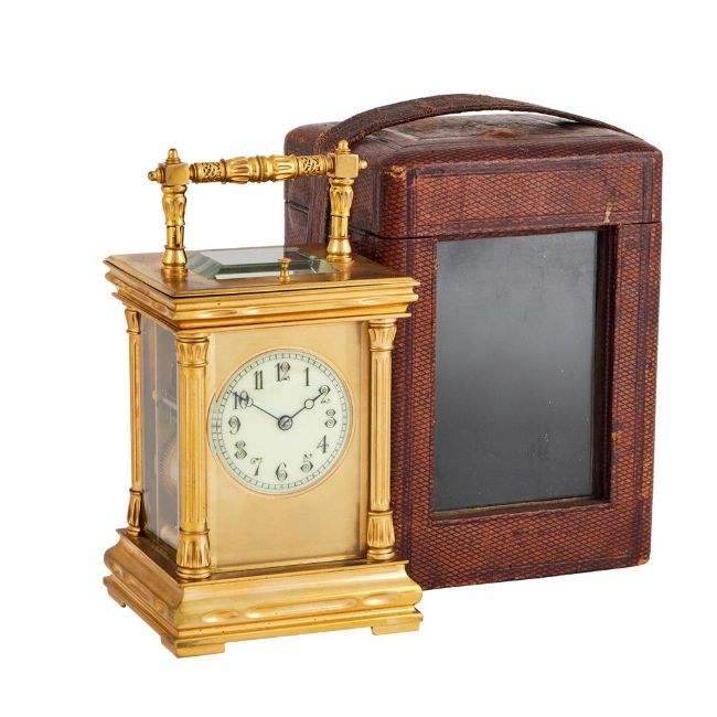 The eight-day two train gong striking movement with platform lever escapement regulated by sprung bimetallic balance, the frontplate stamped with number 8200 towards the lower margin and backplate stamped with a direction of wind arrow to centre over further number 8200 to bottom right, the circular cream enamel dial with vertically aligned Arabic hour numerals set within a frosted gilt mask, the gilt brass bevel-glazed anglaise variant case with decorative 'filigree' band decorated hinged carrying handle, over repeat button towards the front edge of the top and cornice incorporating scooped ogee moulding, with fluted three-quarter columns to angles incorporating Egyptian influence caps and bases and the rear with pin hinged door, on ogee-moulded skirt base with shallow block feet; with original tooled Morocco leather covered protective carrying case.