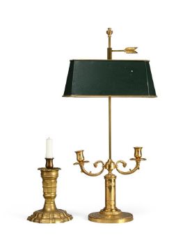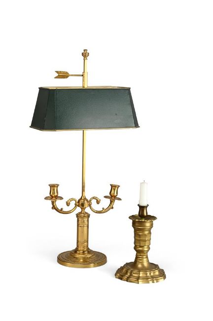 TOGETHER WITH a French brass candlestick of squat form