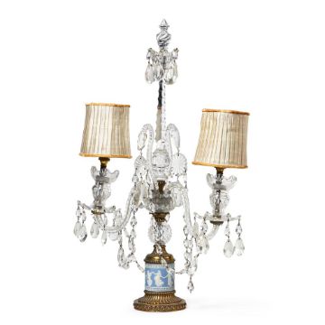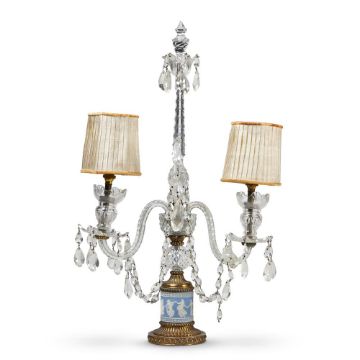 A CUT GLASS, PALE BLUE JASPER & GILT METAL TWIN BRANCH CANDELABRUM