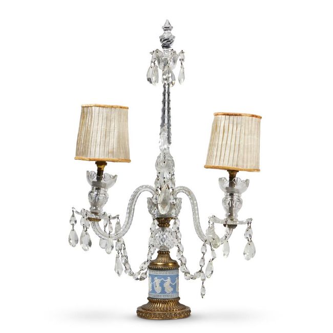 With a central spire and serpentine branches, hung with chains of facetted drops, on a reeded and beaded plinth, the jasper decorated with dancing figures after the Borghese Dancers, adapted for electricity
