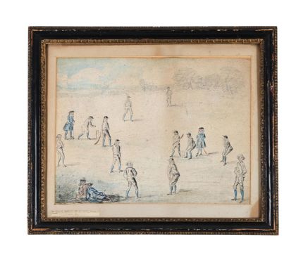 ENGLISH SCHOOL, MID EIGHTEENTH CENTURY, AFTER FRANCIS HAYMAN (BRITISH 1708-1776) CRICKET MATCH IN MARYLEBONE FIELDS, EARLY 1740s Pencil and watercolour 31.5 x 42cm (12¼ x 16½ in.)Provenance: Messr Hutchinson and Co, Publishers; their sale, Christie's, London, 4 April 1952. Mr H.A. Cohen, his sale, Phillips London, 26th January 1995, lot 116 as by Francis Hayman (£10,000)Exhibited: Sheffield, Graves Art Gallery, Two Centuries of Cricket Art, July 1955, No. 188The present drawing relates to Charles Grignon's, 1748 engraving after Francis Hayman's painting in the collection of the M.C.C. The painting of the full double wicket version of the game is one of the most important early visual records of cricket and a source for the illustrations which accompanied successive editions of the laws of the game.