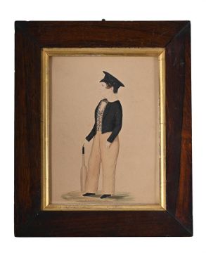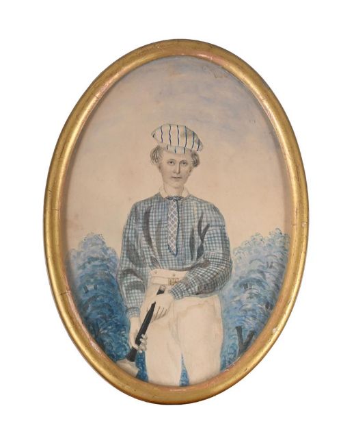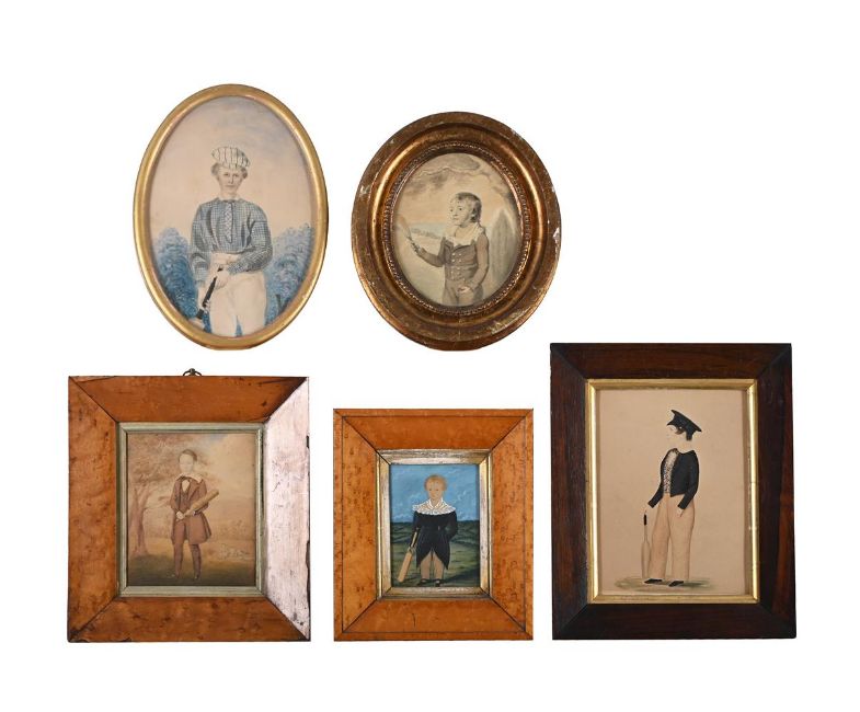W. MURRAY (BRITISH 19TH CENTURY) PORTRAIT OF A BOY CRICKETER IN SIDE PROFILE Pencil and watercolour Signed and dated '1848' (lower centre) 19.5 x 14cm (7½ x 5½ in.) Together with four similar portraits, one painted over a printed base, various sizes, the largest 23 x 16cm (5) To be sold without reserve.