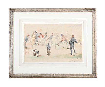 FABRITZING [?] (FRENCH 19TH CENTURY) A CRICKET MATCH IN THE TOWN SQUARE, DIEPPE Pencil, ink and watercolour Signed and inscribed 'Dieppe' (lower left), further inscribed 'Pour un amical/Fabritzing' (lower right) 24 x 35.5cm (9¼ x 13¾ in.)Provenance: Sale, Christie's, London, British and Continental Watercolours, 30 September 2004, lot 24 To be sold without reserve