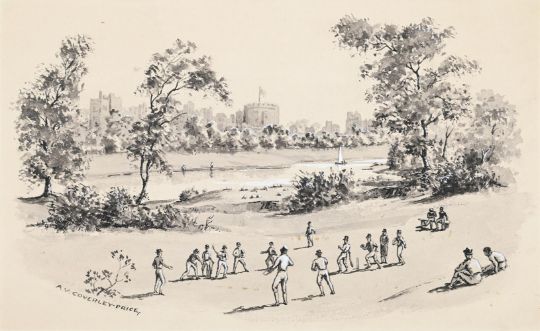 λ ARTHUR VICTOR COVERLEY-PRICE (BRITISH 1901-1988) CRICKET AT WINDSOR Pen, ink and monochrome wash heightened with white Signed (lower left) 15.5 x 25cm (6 x 9¾ in.) Together with a watercolour of a village cricket match (2) To be sold without reserve