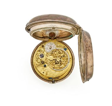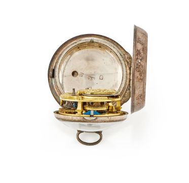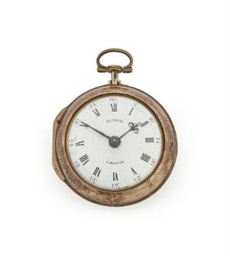 A GEORGE III SILVER PAIR-CASED VERGE POCKET WATCHWILLIAM PLIMER, LONDON 1779The gilt full-plate single fusee movement with four square section baluster pillars pinned through the backplate, scroll-pierced stop-iron block and verge escapement regulated by sprung three-arm steel balance with Tompion type regulation, the backplate with symmetric foliate scroll engraved and pierced balance cock centred with a rosette over a Classical urn and scroll-engraved wedge-shaped foot, flanked by silvered regulation disc set within a conforming engraved panel opposing signature Will'm Plimer, London and No. 1003, the circular slightly convex white enamel Roman numeral dial signed PLIMER, LONDON to centre, with Arabic five minutes beyond the outer dot minute track and sculpted blued steel beetle and poker hands, the inner case applied with suspension post and bow at twelve o'clock, the outer case with moulded collar to circumference, both cases with marks for London 1779 makers E.L. The pillar plate 3.5cm (1.375ins) diameter, the outer case 5cm (2ins) diameter. A watchmaker with the name William Plimer, London does not appear to be recorded in the usual sources. Condition Report: Movement is in clean condition with no visible evidence of alteration or noticeable replacements, the gilding has minimal wear, discolouration or other blemishes. The movement is currently wound but not running due to apparent weakness in the spring - will run when a small amount of motive force is applied to the train. The dial has a very small chip to the lower edge at 6 o'clock otherwise faults are very much limited to a couple of light surface blemishes, hands are nicely worked and appear undamaged. The inner case has had the suspension post re-secured with solder otherwise is in good original condition. The outer case has wear to the clasp button and slight surface denting otherwise is in good original condition.Watch does not have a winding key. Condition Report Disclaimer