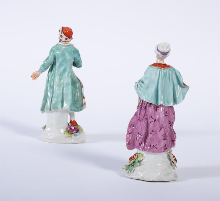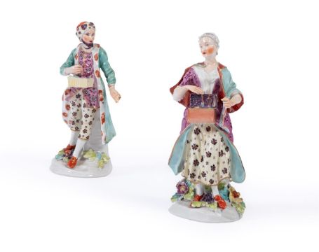 A PAIR OF DERBY FIGURES OF A JEWISH PEDDLER AND COMPANION CIRCA 1760 19cm high Provenance: The Lynch House, Kensworth, the collections of H W Rubin and E W Rubin and thence by descent Condition Report: Peddler: Thumb and two fingers missing from his left hand. Areas of restoration to hat. Chip to top of flask in his right hand and the bottle protruding over the edge of the basket. Some small nibbles to the foliage on the base. Slight areas of wear. Woman: Small chips to foliage, firing fault to handkerchief, other small firing faults. Please see additional images available from the Dept. upon requestCondition Report Disclaimer