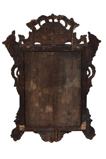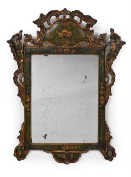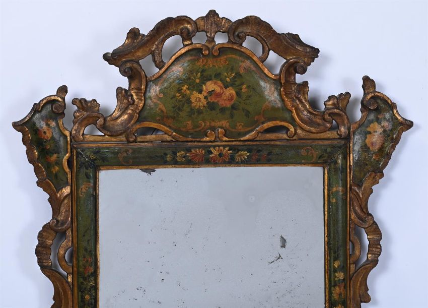 AN ITALIAN GREEN PAINTED, PARCEL GILT AND FLORAL DECORATED MIRROR VENICE, LATE 18TH OR EARLY 19TH CENTURY 103cm high, 77.5cm wide Condition Report: There are scratches, knocks, marks and cracks consistent with age and use.The mirror plate with aged and distressed silvering.There is some small evidence of old worm, not easily evident as the mirror is painted.There are some cracks, repairs and braces to the frame. There are some small losses to the top of the crest, though only obvious under close inspection to the back of the mirror.This carved polychrome painted and parcel gilt mirror has an appealing look of age, colour and character.Please see the additional condition report photographs through the link, they are a vital part of the condition report.  Condition Report Disclaimer