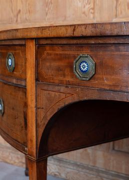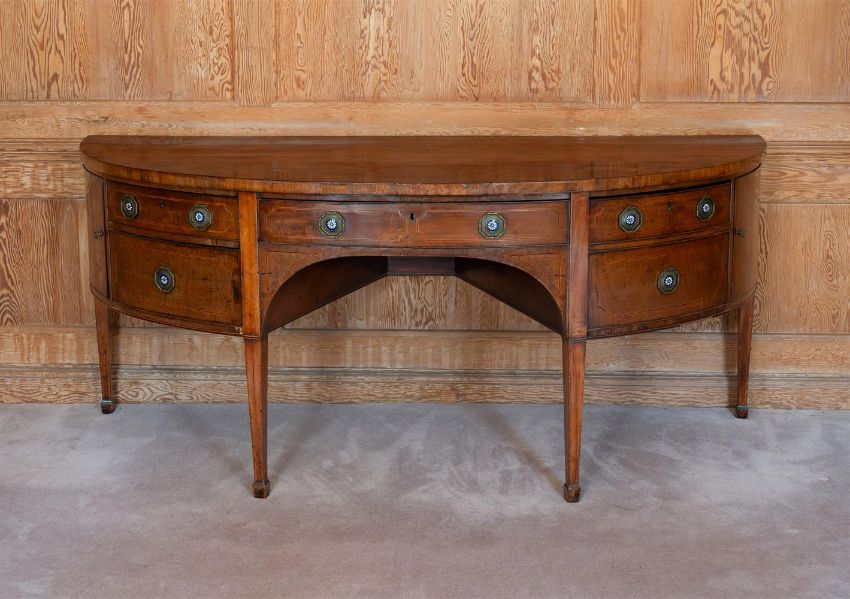 A GEORGE III MAHOGANY AND INLAID BOWFRONT SIDEBOARD CIRCA 1790 With enamel inset handles 90cm high, 204cm wide, 80cm deep Provenance: The Lynch House, Kensworth, the collections of H W Rubin and E W Rubin and thence by descent