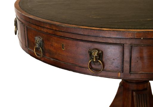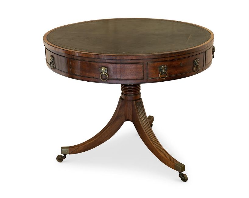 A REGENCY MAHOGANY 'DRUM' LIBRARY TABLE CIRCA 1815 With a tooled leather inset top 72cm high, the top 92cm diameter Provenance: The Lynch House, Kensworth, the collections of H W Rubin and E W Rubin and thence by descent Condition Report: Marks, knocks and scratches commensurate with age and use. Some old chips, splits and losses. The ebonised drawer mouldings and stringing detached in places with some elements present in the drawer. Other elements detached and lacking. NO key is present but all locks are open. the metalware appears to be original. Some fading and discolouration to timber overall. The leather top with additional scratches, marks and fading, with further lines consistent with the underlying construction. Solid and stable overall.Condition Report Disclaimer