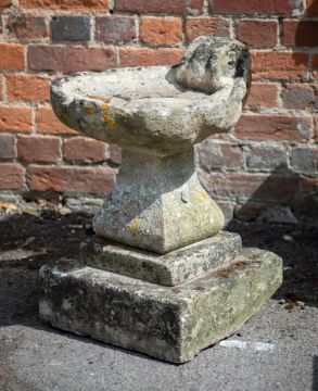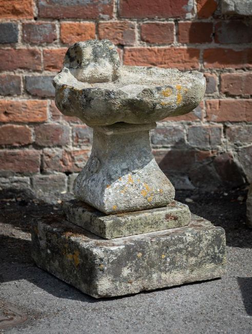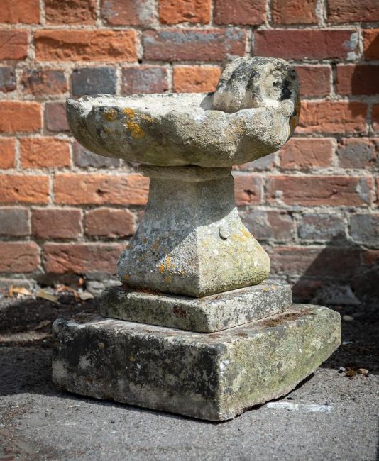 A COTSWOLD STONE BIRDBATH EARLY 19TH CENTURY Of scallop shell form 59cm high, the base 38 x 38cmProvenance: By Repute, from the garden of The Old Mill, Lacock, Wiltshire Condition Report: The bowl with fairly extensive weathering and surface attrition and losses. Edges with chips, some large, retaining some detail to flower motif, to stem. Colour variance to base suggesting it may be associated. Splits fairly easily into 4 parts- 2 man lift into car- total weight approx 50-70kg Please see additional images for visual references to condition which form part of this condition report. All lots are available for inspection and Condition Reports are available on request. However, all lots are of an age and type which means that they may not be in perfect condition and should be viewed by prospective bidders; please refer to Condition 6 of the Conditions of Business for Buyers. This is particularly true for garden related items. All lots are offered for sale "as viewed" and subject to the applicable Conditions of Business for Buyer's condition, which are set out in the sale catalogue and are available on request. Potential buyers should note that condition reports are matters of opinion only, they are non-exhaustive and based solely on what can be seen to the naked eye unless otherwise specified by the cataloguer. We must advise you that we are not professional restorers or conservators and we do not provide any guarantee or warranty as to a lot's condition. Accordingly, it is recommended that prospective buyers inspect lots or have their advisors do so and satisfy themselves as to condition and accuracy of description. If you have physically viewed an item for which you request a report, the condition report cannot be a reason for cancelling a sale. Buyers are reminded that liability for loss and damage transfers to the buyer from the fall of the hammer. Whilst the majority of lots will remain in their location until collected, we can accept no responsibility for any damage which may occur, even in the event of Dreweatts staff assisting carriers during collection. Condition Report Disclaimer