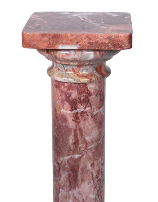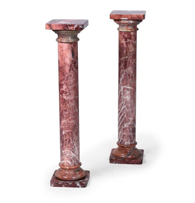 A PAIR OF PINK AND GREY MARBLE PEDESTAL COLUMNS CIRCA 1900 102cm high Condition Report: With mild wear from use, small scuffs and scratches to tops and base margins, infill to stone from manufacture. Tops approx 22.5 by 22.3cm Infill to stone from manufacture, unstable and will almost certainly will need to be mortared before use. Please see additional images for visual references to condition which form part of this condition report. All lots are available for inspection and Condition Reports are available on request. However, all lots are of an age and type which means that they may not be in perfect condition and should be viewed by prospective bidders; please refer to Condition 6 of the Conditions of Business for Buyers. This is particularly true for garden related items. All lots are offered for sale "as viewed" and subject to the applicable Conditions of Business for Buyer's condition, which are set out in the sale catalogue and are available on request. Condition Report Disclaimer