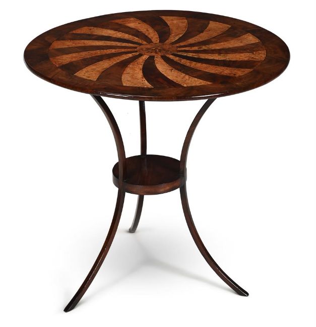 A MAHOGANY, KARELIAN BIRCH AND VENEERED STEEL OCCASIONAL TABLE POSSIBLY BALTIC, EARLY 19TH CENTURY 66cm high, 66.5cm diameter Condition Report: There are scratches, knocks, chips, marks, scuffing and cracks consistent with age and use.The top with a slight bow that is evident when upturned that it does not sit quite flat.The veneer cracks to the top correspond to the sectional joins underneath with some butterfly joints.The fine legs are cleverly made in steel with wood veneers over the metal sabre legs for strength.This is an unusual and ingenious elegant design with the strength of 'concealed' metal legs.Please see the additional condition report photographs through the link, they are a vital part of the condition report. Condition Report Disclaimer