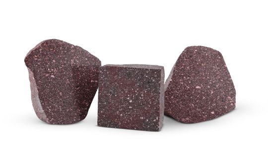 THREE SECTIONS OF IMPERIAL PORPHYRY Each part polished irregular 20.5 x 20 x 9cm irregular 21.5 x 19 x 10cm square 14.5 x 14.5 x 8cm
