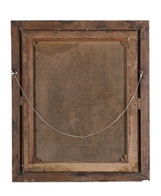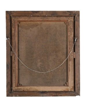 Heavy surface dirt and discolouration. Scattered staining and craquelure with some significant areas of paint loss and lifting, notably to the upper left quadrant and along the left and right extreme edges. Surface scuffs and scratches. Inspection under UV reveals unevenly distributed green varnish and various restorations notably to the sitter's visage, a restoration above her head and an area to the upper right corner. This work would benefit from professional treatment to stabilise the paint surface and clean the work.