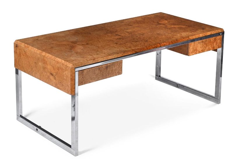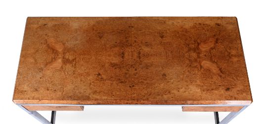 GUY LEFEVRE (FRENCH) ATTRIBUTED A DESK; CIRCA 1970 Burred elm, chrome Likely made/manufactured for Maison Jansen 77cm high, 180cm wide, 58cm deep Condition Report: Knocks, scratches, abrasions, wear commensurate with age and use. Missing the lower stretcher to the chromed metal base. Please see additional images available from the Dept. upon request.Condition Report Disclaimer
