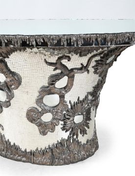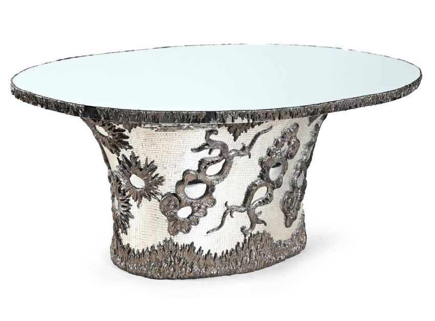 ORIEL HARWOOD (BRITISH, B.1960) 'SCINTILLA' TABLE; EARLY 21ST CENTURY Wood base, covered in mirror mosaic tiles and silvered ceramic adornments, with an oval mirror top 71.5cm high, 178.5cm wide, 120cm deep Condition Report: The table presents really well. There are a few light scratches to the table top but all minor. The foot is in remarkably good condition considering the intricacy of the decoration. The edge has multiple small knocks and losses, as you would expect with the protruding edge, there are two larger missing sections of ornamentation (from 1 inch to 1.5 inch).Condition Report Disclaimer