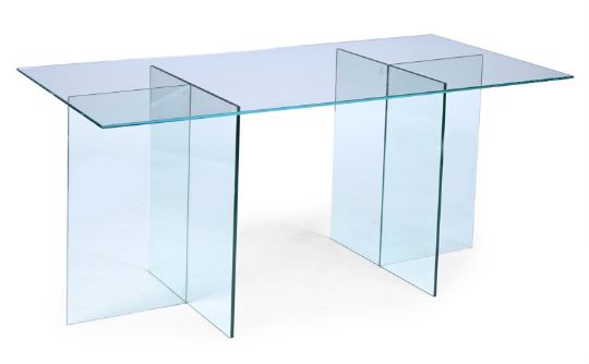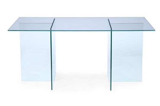 IN THE MANNER OF TONELLI DESIGN (ITALIAN) GLASS TABLE; 21ST CENTURY Reinforced glass, two adjustable legs 74cm high, 164cm wide, 90cm deep