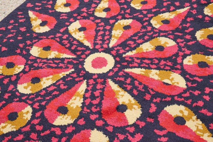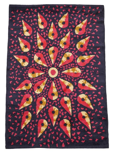 JEAN PICART LE DOUX (FRENCH, 1902-1982) RUG; SECOND HALF 20TH CENTURY Deep purple wool with radiating patterning in pink, yellow and black Signed in weave to verso 'JEAN PICART LE DOUX' 234cm x 166cmProvenance Purchased form David Allan, Paris, 2000