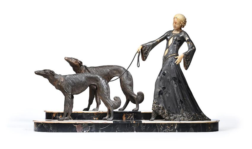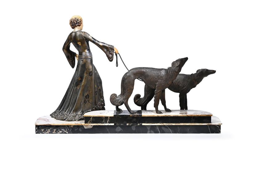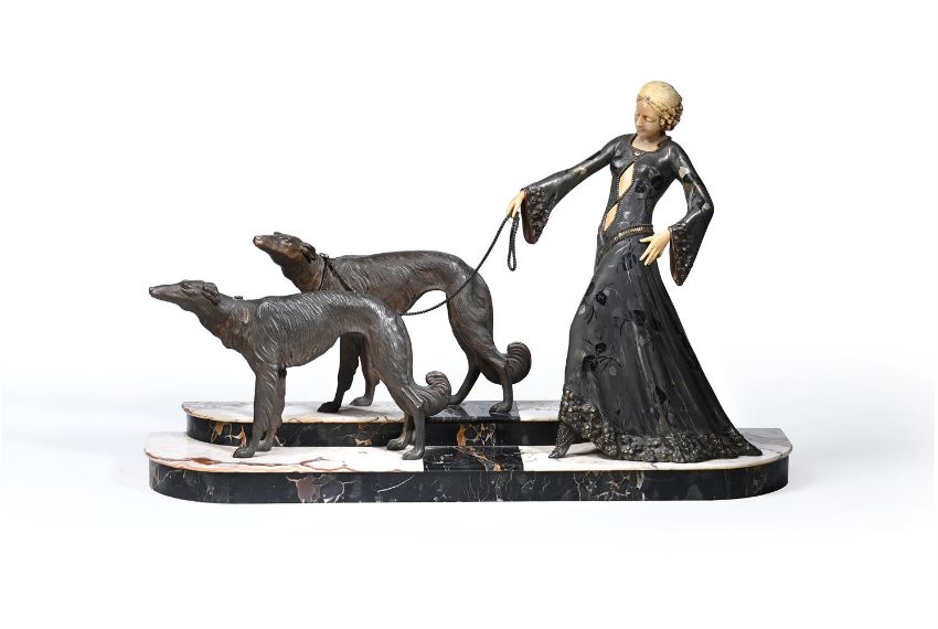 GEORGES GORI (FRENCH, 1894-1944) A LARGE ART DECO STUDY OF A LADY WITH TWO BORZOIS, CIRCA 1930 Cold-painted and patinated art metal, ivorine, marble Inscribed 'G.Gori' to base 50.5cm high, 81cm wide, 20.5cm deep Saleroom notice: Please note that the catalogue description has been updated from G Gori to Georges Gori (French, 1894-1944). This is correct online. Condition Report: With minor wear, marks, knocks and scratches commensurate with age and use. Some tiny old chips/losses to the marble (mainly to the reverse of the bases, some old small splits to the ivorine. Some surface deposits to the marble. Of substantial weight.    Condition Report Disclaimer