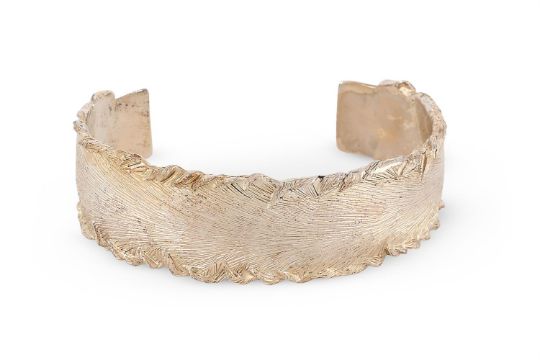 SIMON BENNEY (BRITISH, B.1966) A 'FEATHER' BANGLE; 1997 Silver, in original leather presentation box. Stamped with artist's mark and London hallmarks Inner width; 6.8cm wide Saleroom notice: Please note that this piece is by Simon Benney and is stamped with his marks, not Gerald Benney. Simon Benney is Gerald's son and took over running the business in the 1990s. This information is correct online.
