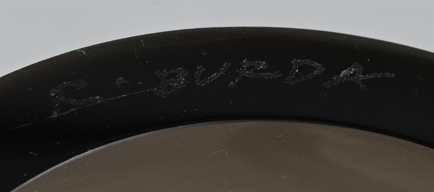 λ RUDOLF BURDA (CZECH, B.1973) GLASS SCULPTURE; CIRCA 2000 Black frosted and clear glass Signed 'R.BURDA' 39.5cm high Together with a signed brochure from the artist.