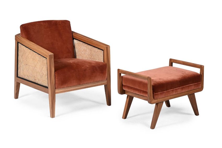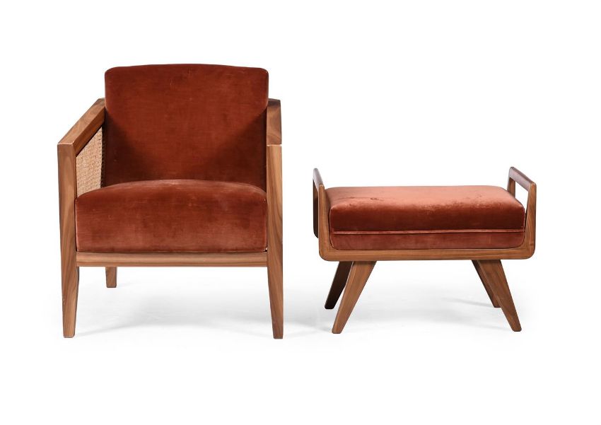 BESPOKE SOFA LONDON (BRITISH, EST.2007) 'KHALID' LOUNGE CHAIR AND OTTOMAN; 21ST CENTURY Oak frame, rattan detailing to back and sides, russet velvet upholstery Chair: 80cm high, 67.5cm wide, 90cm deep Ottoman: 50cm high, 70cm deep, 45cm deep Condition Report: Some marks, knocks, scratches, abrasions, indentations and knocks to the frames from use in a domestic setting, the velvet to the seats with some unevenness from use with some variation Frames entirely solid and stablePlease see additional images for visual reference to condition Condition Report Disclaimer