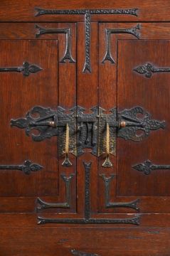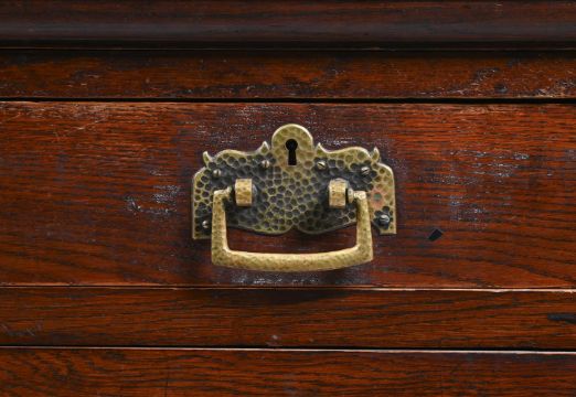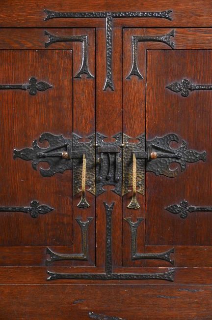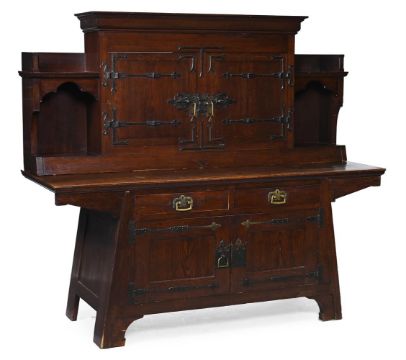 KARL SCHMIDT-HELLERAU (1873-1948): ATTRIBUTED A LARGE SIDEBOARD; LATE 19TH CENTURY Oak, metal hinges/handles Stamped to lock fixing of drawers 'F.O. SCHMIDT WIEN' 176cm high, 200cm wide, 71.5cm deep Provenance Property of a Private Collection Roberto Polo, Paris, 2003/4