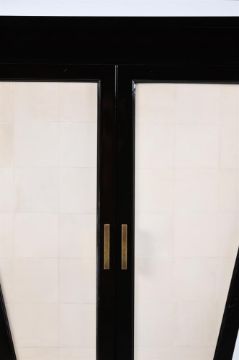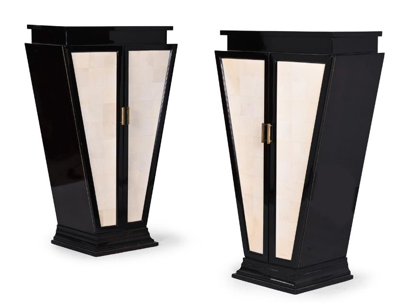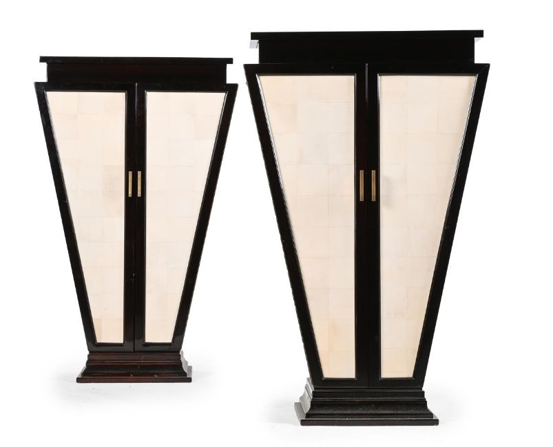 A PAIR OF ART DECO STYLE WARDROBES SECOND HALF 20TH CENTURY Lacquered wood, synthesised vellum, brass handles, glass shelves 148cm high, 98cm wide, 46cm deep Saleroom notice: Please note the date and guide estimate in the Dreweatts printed catalogue are incorrect. The wardrobes date from the second half of the 20TH Century and the correct guide estimate for this lot is £800-£1,200.   Condition Report: Marks, knocks, scratches, abrasions consistent with age and useSome old chips and losses to the lacquer around some underlying joints, 'vellum' with some uneveness to the surface,The handles are 'worn' possibly to simulate greater age than these posses Some damage to internal glass shelves, noticeable crack to rear of one where it sits on the support Please see additional images for visual reference to condition and appearance Condition Report Disclaimer