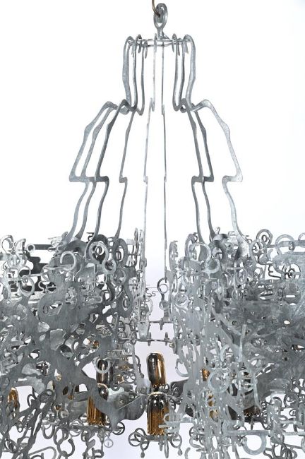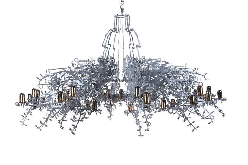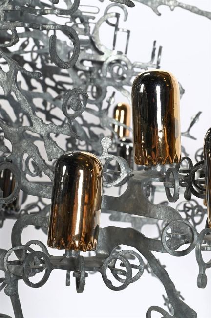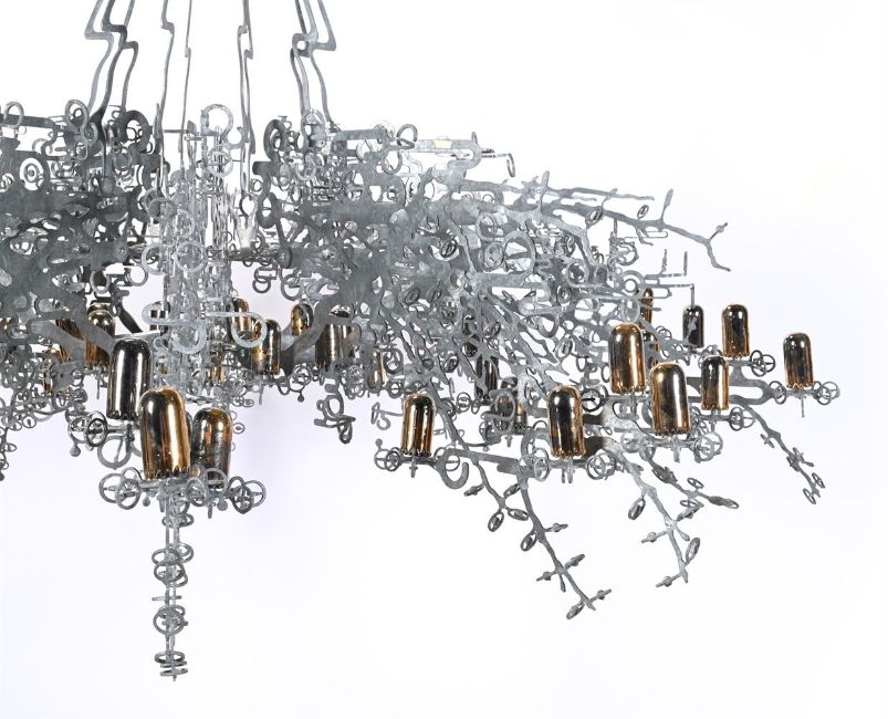 JESSE SMALL (AMERICAN, B.1974) 'PLAYER 1' CHANDELIER; DESIGNED 2008 Cut steel and gilt lustre fired porcelain 320cm hang, 200cm diameterJesse Small, originally from Los Angeles and currently the artist in residence at the Angels Gate Cultural Centre in San Pedro, California, is recognised for his inventive use of metal across public art, architecture and design. Player 1, a chandelier conceived in 2008, continues this exploration of material and ornament. Cut steel is worked into a dense, branching structure, animated with gilt-lustre porcelain lights that fuse fragility with strength. In Small's words, it "exposes the rules of decoration by inserting some oddity into classic forms."Reflecting on the piece with his students, he remarked that "it's easy to ignore a sculpture on a pedestal or the floor. But with a chandelier, everyone looks up." This reorientation of attention places Player 1 within a wider contemporary dialogue, alongside artists such as Jorge Pardo, Ingo Maurer and Cerith Wyn Evans, who have similarly reimagined the chandelier as both sculpture and spatial intervention. Condition Report: The sculptural chandelier is in very good condition. No breaks or losses. The 50 high-fire porcelain pieces with a variety of silver and gold lustre, some mixed, some decorated with the vintage space invaders pattern - hence 'Player 1'. All metal elements in excellent condition with even, intended mottled, matt silver finish. It should be noted that the piece has no lighting fitments or fittings. A single light blub could be suspended through the centre, to make it a light, or an expert could look at a variety of ways to light it at the point of installation.Condition Report Disclaimer