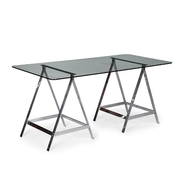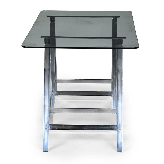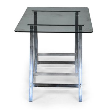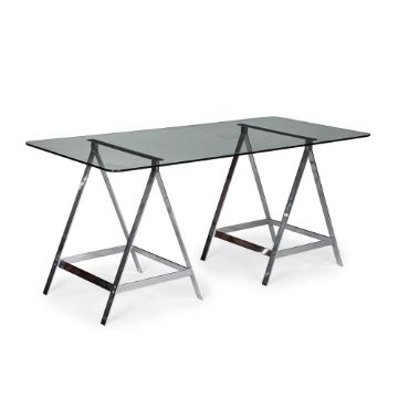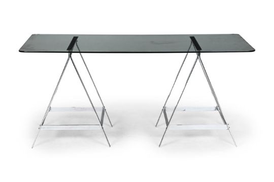ALESSANDRO ALBRIZZI (ITALIAN, 1934-1994) 'A-FRAME' TRESTLE TABLE; 1970s Chrome; with rectangular glass top. 77cm high, 170cm long, 79cm deep Provenance: Property of a Gentleman Albrizzi opened his first shop on the King's Road, London, in 1968, before moving to Sloane Square.Dreweatts would like to thank Chantal Spar for her assistance in cataloguing this lot. She worked for Albrizzi between 1970-1972. Condition Report: The glass top is a replacement security glass. These frames could be purchased without or with custom glass tops. The glass is in good condition, as is the frame - with a few minor nicks, scuffs, scratches, marks in line with age and use.Condition Report Disclaimer