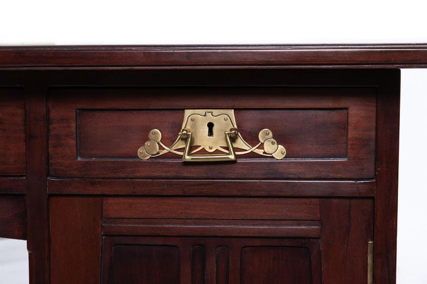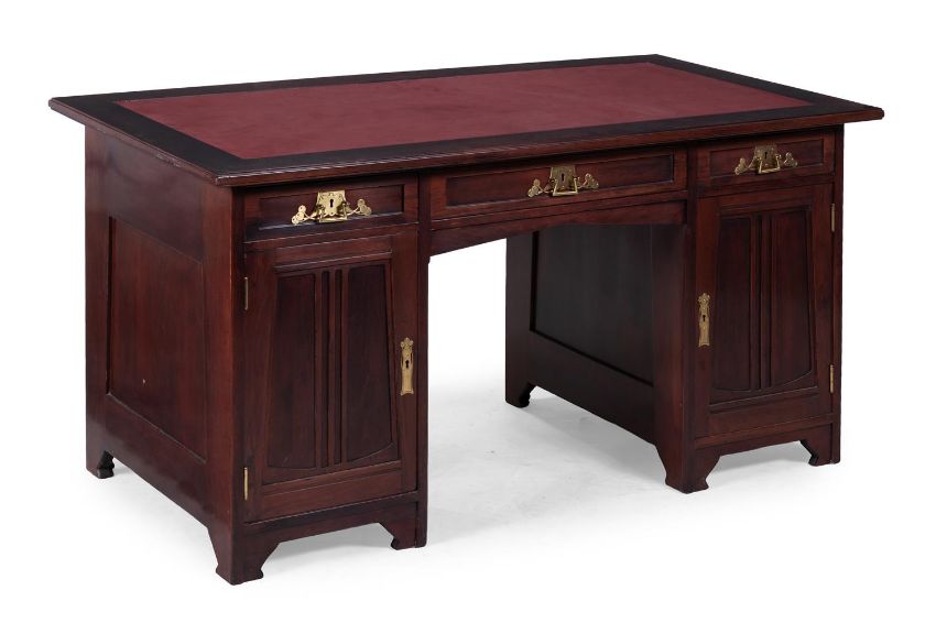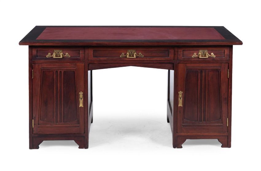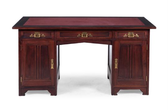 JOSEF MARIA OLBRICH (1867-1908); ATTRIBUTED A DARMSTADT DESK; CIRCA 1900 Stained wood, with red leather inset top Made by Ludwig Alter (1847-1908), Darmstadt, Germany. Stamped 'LUDWIG ALTER DARMSTADT' to central drawer fixing 77cm high, 149cm wide, 80cm deep Provenance Property of a Private Collection Willie Clegg, Nettlebed Antiques, early 2000s