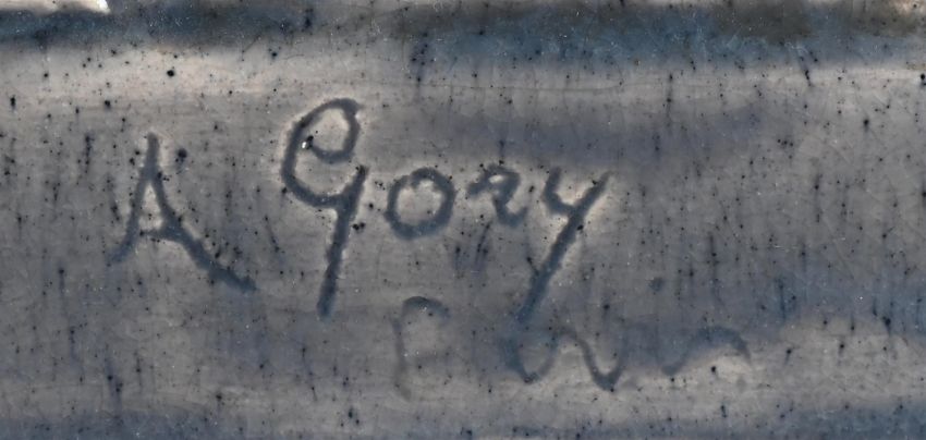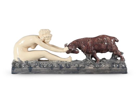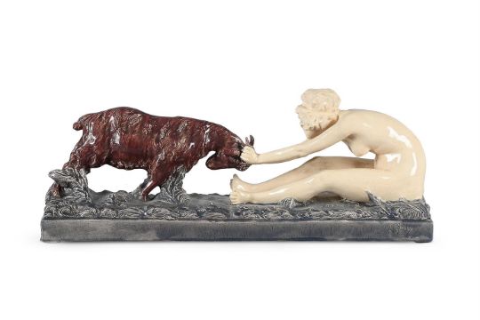 AFFORTUNATO GORY (ITALIAN, 1869-1925) AN ART DECO FIGURAL SCULPTURE; CIRCA 1920 Glazed stoneware, depicting a female nude and a goat Inscribed to base 'A Gory' 24cm high, 60cm wide, 16cm deep