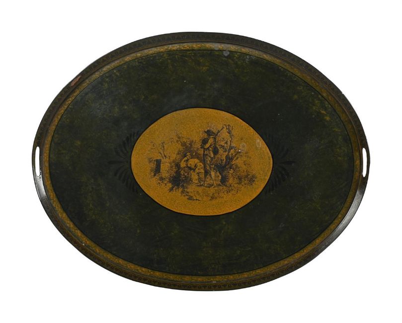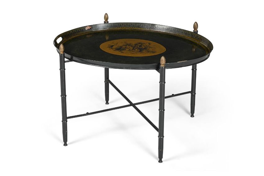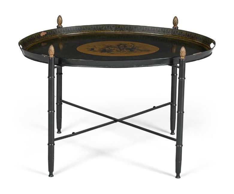 A TOLE PEINTE TRAY TOP OVAL OCCASIONAL TABLE ON STAND