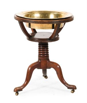 the mahogany base with splits and cracks, chips and losses, on brass roller castors, please see additional images