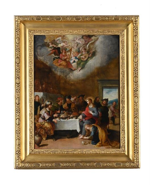 FRANS FRANCKEN THE YOUNGER (FLEMISH 1581-1642) CHRIST IN THE HOUSE OF SIMON THE PHARISEE Oil on panel Signed 'D. o. ffranck. in. et f.' (lower right); further titled by later hand 'The Lord's Supper' (to label, verso) 58.4 x 44.5cm (22 x 17½ in.) Provenance: (Probably) acquired by Edward Southwell, MP (1705 - 1755) for Kings Weston House near Bristol Thence by family descent until 2024Literature: Inventory of Kings Weston House Contents, dated 27th December, 1777. Listed among the Paintings in Lady Clifford's Dressing Room (page 26, item 4 "The Washing of our Saviour's Feet by old Frank") Long considered a painting by Frans Francken the Elder, this remarkable discovery is now recognised as a fine example of the work of Frans Francken the Younger. Hidden from public view for more than 250 years, it is listed in the 1777 inventory of goods from Kings Weston House, where it was located in Lady Clifford's Dressing Room. According to the inventory, it was displayed alongside works attributed to Claude Lorrain, Paul Bril, Cornelis van Poelenburch, and Godfrey Kneller.Although mistakenly recorded as "The Washing of our Saviour's Feet by Old Frank" (Frans Francken the Elder), the quality of the painting - evident in the free, almost sketch-like yet confident brushwork of the background figures, the richly detailed table, and the small, glimmering tears suspended in mid-air from the woman washing Christ's feet - clearly reflects the hand of Frans Francken the Younger.The 18th-century attribution to Francken the Elder likely stems from the signature "D.o. ffranck," where "D.o." stands for the Flemish de oude, meaning "the Elder." However, this signature was actually used by Frans Francken the Younger from the late 1620s. Prior to the death of his father in 1616, he had signed his works as "the young Frans Francken." Furthermore, the subject of the painting has been misidentified over the years, as suggested by a label on the reverse reading "The Lord's Supper." While the Kings Weston House records come closer to the correct subject, the painting actually depicts an episode from the Gospel of Luke (7:36-50), in which Christ dines at the house of Simon the Pharisee. During the meal, a sinful woman, having learned that Christ would be present, enters the house and anoints His feet. Only one other known painting of this subject by Francken survives, now in the collection of the Museum of Fine Arts in Rennes.Francken's fluid handling of paint and his sophisticated sense of composition are clearly evident here. In the upper half of the painting, the angels appear shaped and softened by light, creating a striking contrast with the richly detailed, earthbound table below. This compositional approach establishes a powerful interplay between the ethereal, celestial realm above and the material world below. Owing to this distinctive quality in his work, Francken's paintings were highly sought after and went on to inspire later artists such as Jan Brueghel the Elder and Peter Paul Rubens. Condition Report: The panel shows a thin vertical crack along the left edge, just to the right of the last seated figure on that side. This crack has been restored, with larger areas of restoration visible near the lower border. A few retouches are also present on the yellowish floor along the bottom edge. Under UV light, scattered areas of reinforcement can be seen on the still life on the table and on the figures behind, as well as two patches near Christ's hand and to the right of His head. Overall, the painting appears to be in good condition, with recent professional restorations.Condition Report Disclaimer