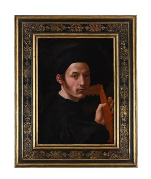 FLORENTINE SCHOOL (16TH CENTURY) PORTRAIT OF A MUSICIAN WITH A LUTE Oil on poplar 52 x 37cm (20¼ x 14½ in.) Provenance: Sale, Dorotheum, Vienna, 23 November 2018, lot 134 (as Tuscan School 16th century) This striking portrait of a man, proudly holding his lute and confidently wearing a large embroidered hat, is a defining example of 16th-century Florentine portraiture. Strong similarities can be seen in the direct gaze of the sitter, the prominent hat (which became visible after the cleaning of the background following the painting's acquisition in 2018), and the handling of the paint, with a portrait once attributed to Jacopo Carucci, known as Pontormo, from the Mainoni Baldovinetti Collection, and registered in the Fototeca Zeri as no. 35525 (Fig. 1).Artists in 16th-century Florence were known to gather in intimate cultural circles alongside poets, musicians, and merchants. These gatherings often involved the reading of Dante, Petrarch, and classical authors, as well as musical performances and recitations. One probable locus of such activity was the Oratory of Saint Cecilia in Fiesole, just outside Florence. The sitter may be envisioned as a member of these cultural circles, confidently exhibiting his erudition through the presence of the lute. Music was a sign of cultural accomplishment, prized by artists and the elite, and it was not uncommon for sitters to pose with their musical instrument (see for example Pontormo's Portrait of Man with a Lute in the Alana Collection, Newark, Delaware) The present painting is registered in the Fototeca Zeri (no. 36591), prior to its restoration, as the work of Zacchia di Antonio da Vezzano, known as Zacchia the Elder or Paolo Zacchia (active 1519-1561). This attribution was originally proposed by Giuliano Briganti. Condition Report: The panel has been cradled, cleaned and re-varnished. There are a number of superficial surface cracks and scratches, but no obvious splits to the panel. Some of these cracks with associated in-filling, which is visible in a raking light. There is some fine craquelure, and paint shrinkage throughout. The paint also wearing thin in some areas. Rubbing and abrasions to the framing edges. Inspection under UV light reveals retouching and in-filling throughout, as well as a green cloudy varnish.Condition Report Disclaimer