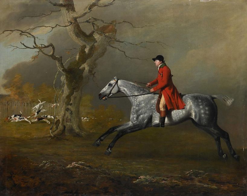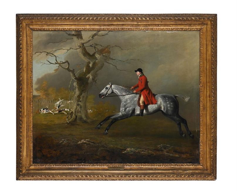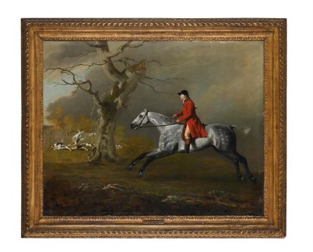 ‡ BEN MARSHALL (BRITISH 1768-1835) THOMAS SEBRIGHT, HUNTSMAN TO THE QUORN AND LORD FITZWILLIAM, MOUNTED, WITH HOUNDS IN FULL CRY Oil on canvas 73.9 x 93cm (29 x 36½ in.)Provenance: The Hon. Kathleen Eykyn (1909-1985), and by descent.Literature: D. Livingstone-Learmonth, The Horse in Art, London and New York, 1958, p. 28, pl. 47. A. Noakes, Ben Marshall 1768-1835, Leigh-on-Sea, 1978, p. 56, no. 220.Exhibited: London, Victoria & Albert Museum, Third International Art Treasures Exhibition, 2 March-29 April 1962, no. 29. Leicester, Leicester Art Gallery, Ben Marshall 1768-1835... a commemorative exhibition, 7 October-5 November 1967, no. 8 (lent by the Hon. Mrs K. Eykyn).Thomas Sebright, served Lord Fitzwilliam and occasionally George 'Squire' Osbaldeston, leader of the Quorn Hunt. Sebright was highly regarded and earned countless mentions in contemporary hunting diaries. This picture was enthusiastically described by David Livingstone-Learmonth as 'one of the finest Ben Marshalls in existence' (loc. cit.).   Condition Report: The canvas has been lined. Rubbing and abrasions to the framing edges, including a large and smaller area of loss along the upper right edge (approx. 10cm and 3cm). A further smaller patch of scattered loss running along the right edge. Craquelure throughout, with some areas just starting to lift, particularly along the upper edge. Stretcher marks visible. Some light surface dirt throughout. Inspection under UV light reveals scattered retouching and in-filling throughout.Condition Report Disclaimer