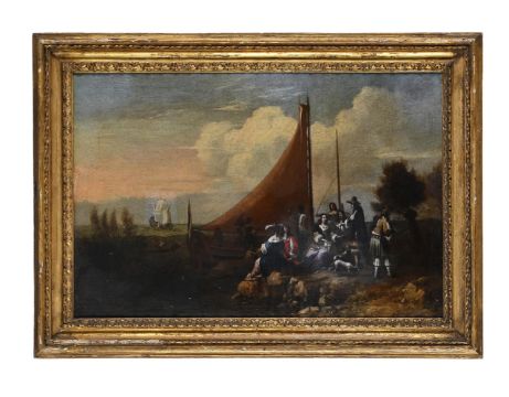 FLEMISH SCHOOL (17TH CENTURY) FIGURES ON A QUAY Oil on canvas 50 x 75cm (19½ x 29½ in.)Provenance: Sale, Mallams, Oxford, 17 November 2018, lot 363 Condition Report: The canvas has been lined. The lining process has caused the surface of the canvas to undulate. The painting is wearing thin, and there is a dirty yellow varnish present. Light surface dirt embedded within the surface of the canvas throughout. Rubbing and abrasions to the framing edges. There is a small loss o approx. 5 cmm to the lower left quadrant. Further spots of loss scattered throughout. Craquelure present, however the surface appears stable. Inspection under UV light reveals infilling and scattered retouching thought-out, as well as the presence of a patchy green varnish. Condition Report Disclaimer