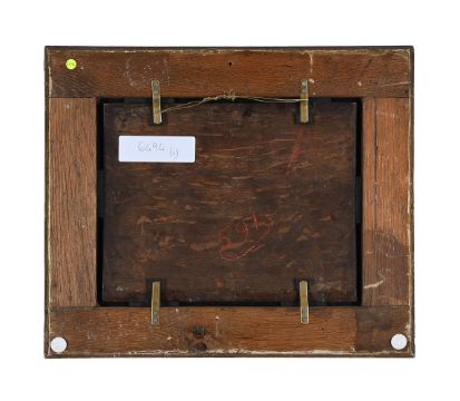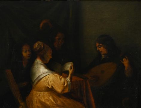 FOLLOWER OF GERARD TER BORCH THE RECITAL Oil on panel 26 x 32.5cm (10 x 12¾ in.) Condition Report: The panel has been revarnished and has started to bow a little. Rubbing and abrasions to the framing edges. Some superficial surface scratching throughout. There are a number of small circular imprints to the panel in the upper left quadrant, presumably the result of the picture being wrapped up in bubble wrap. Very light craquelure, with some very slight associated paint loss to the lower left and right corers. There is also some minimal paint shrinkage predominantly to the lower right quadrant. Inspection under UV light reveal a very heavy green masking varnish which is presumably concealing at least some overpaint. Condition Report Disclaimer